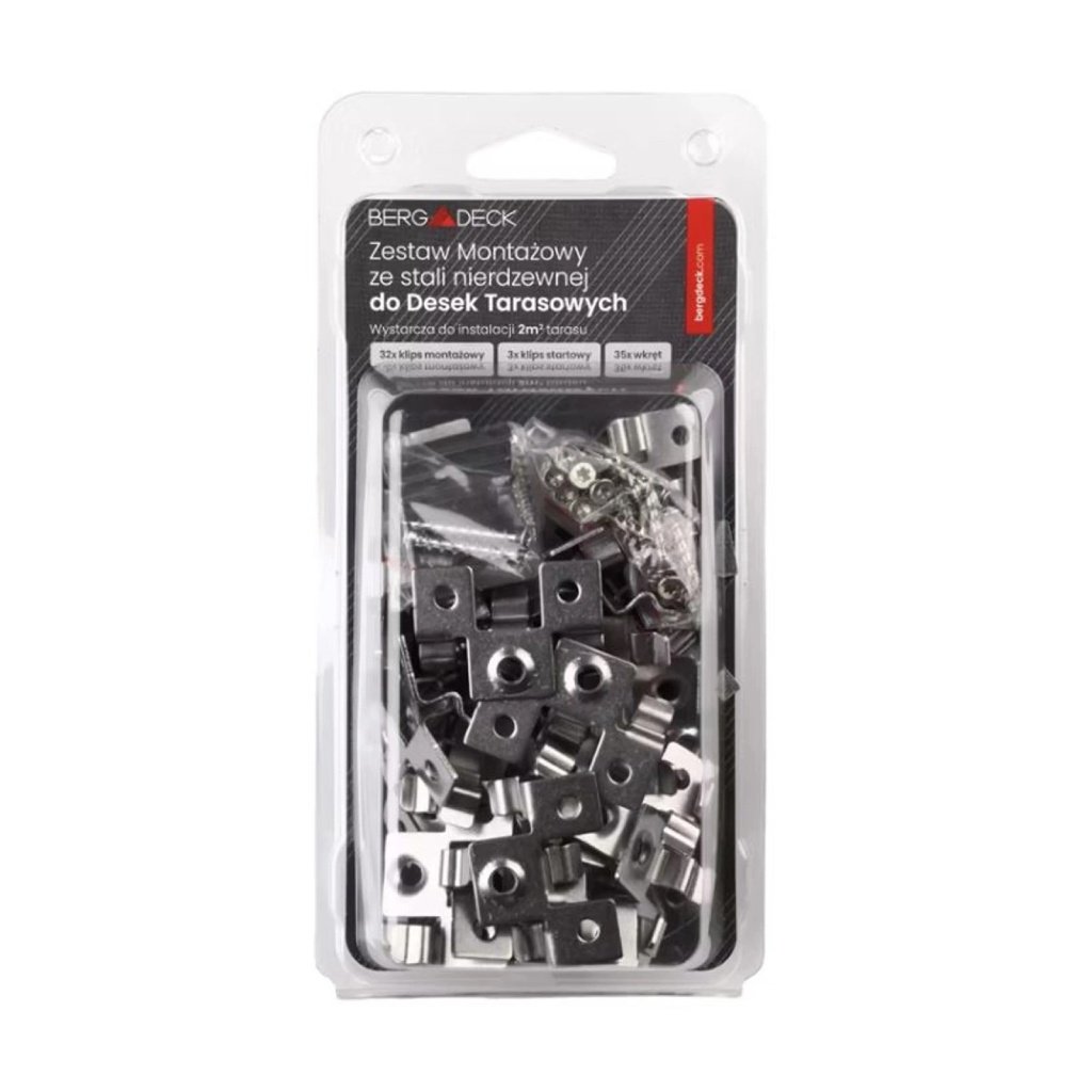 Balení obsahuje 36 kusů montážních klipů , 36 šroubů a 1 bit (sada vystačí na 2 m2 terasy).