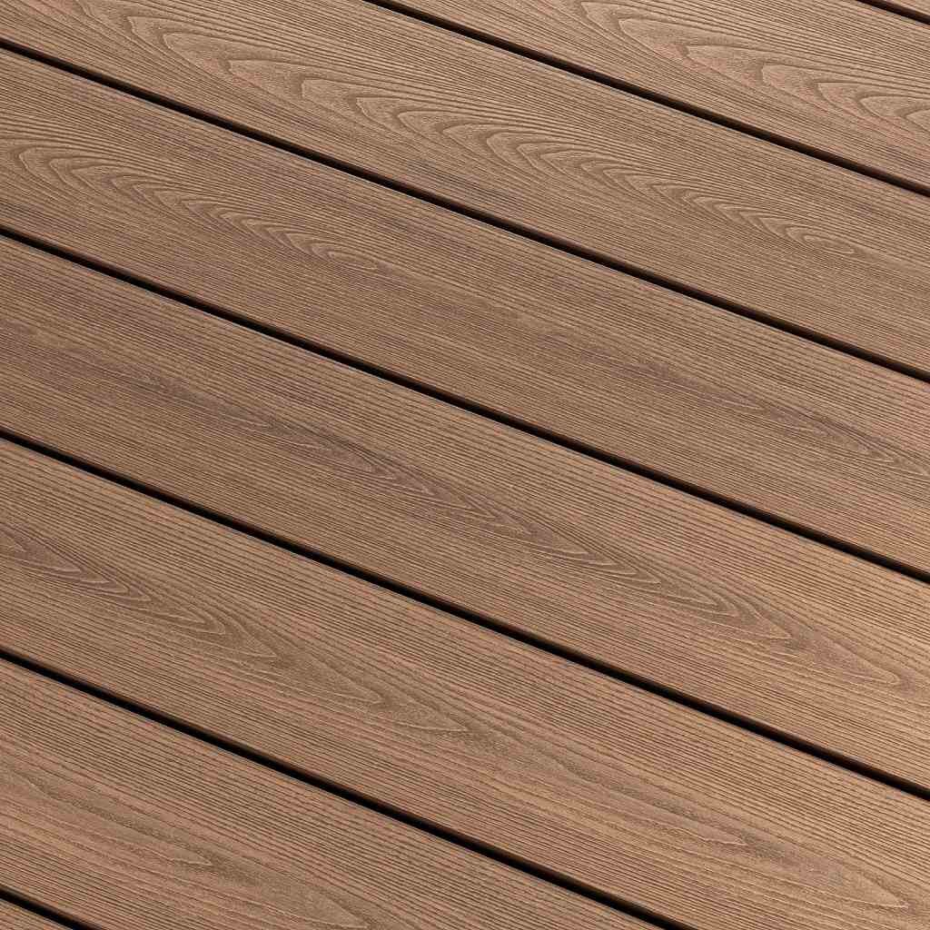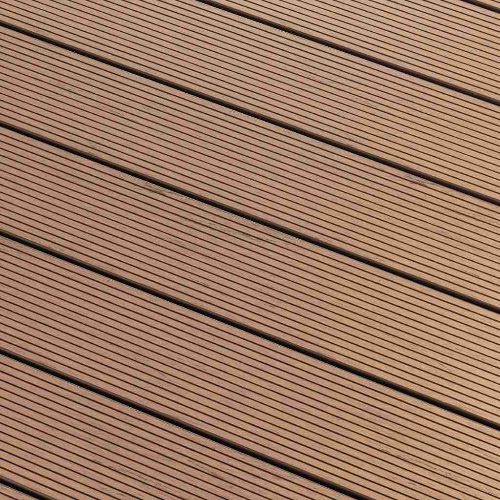 Každé prkno nabízí dvě různé pohledové strany – jednu s jemnou úzkou drážkou, která poskytuje protiskluzový efekt a funkční vzhled, a druhou s elegantním potiskem imitujícím přirozenou kresbu dřeva. Tato variabilita umožňuje snadné přizpůsobení vzhledu terasy konkrétnímu stylu stavby nebo osobnímu vkusu.