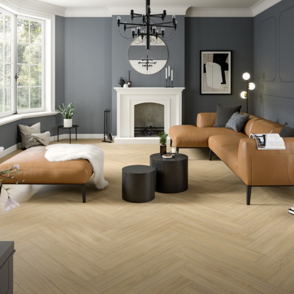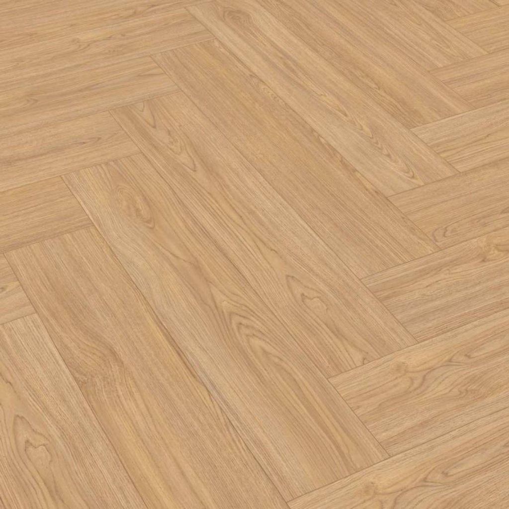 Laminátová podlaha Egger Herringbone v dekoru rybí kosti s autentickým vzhledem dřeva. Odolnost AC4, zámek UniZip, vhodná i pro podlahové topení.