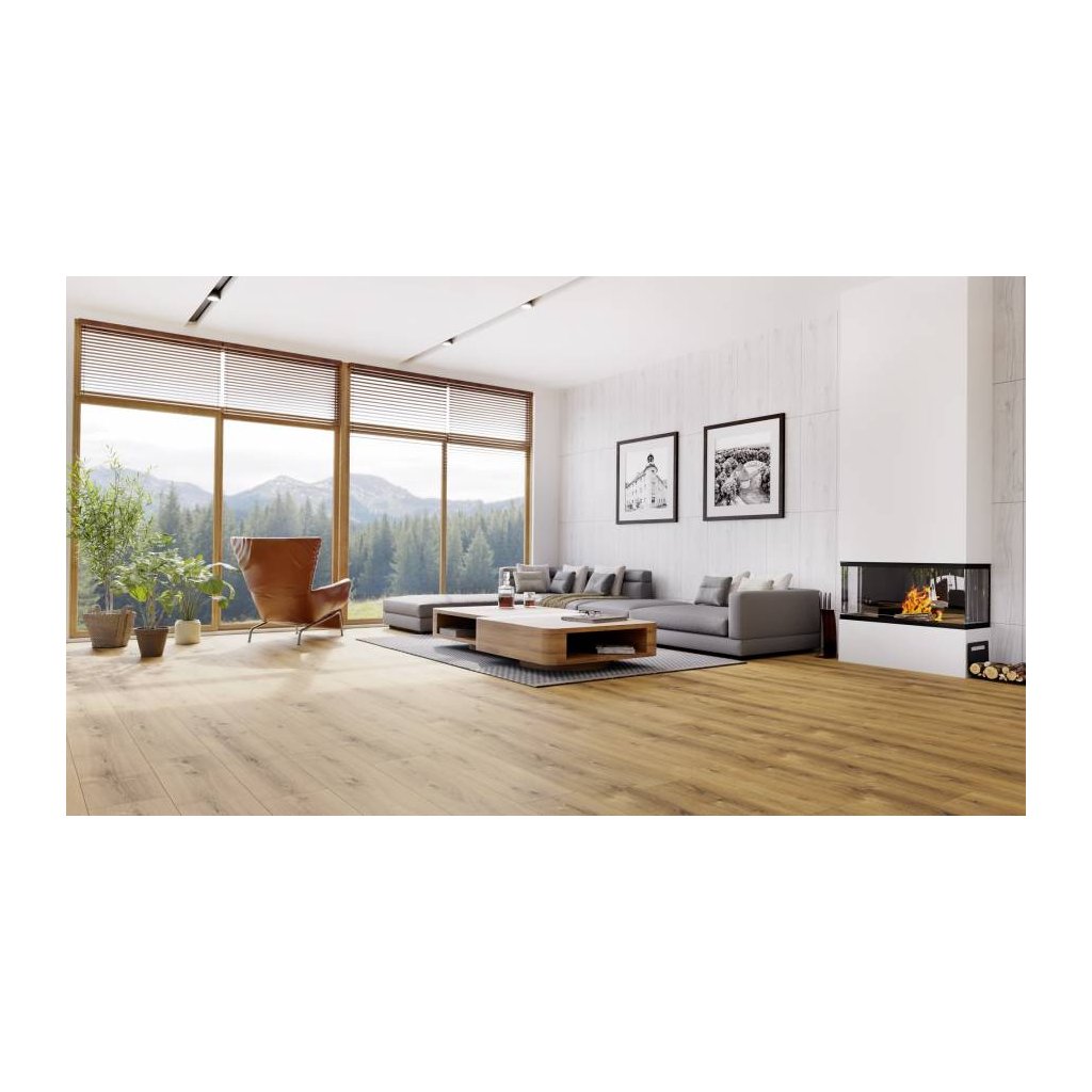 Silné 8mm lamely, vysoká odolnost AC5 / třída 33 a snadná údržba včetně možnosti vytírání mokrým nebo parním mopem z ní dělají ideální volbu i do zatěžovaných prostor. Podlaha je vhodná také pro podlahové vytápění (do 28 °C).